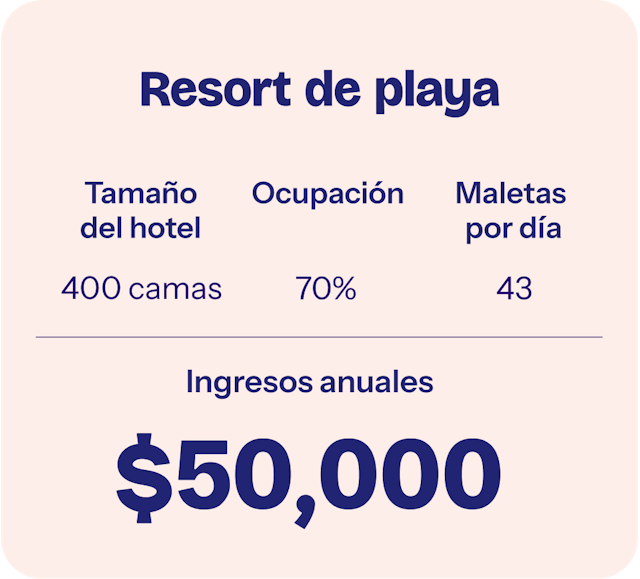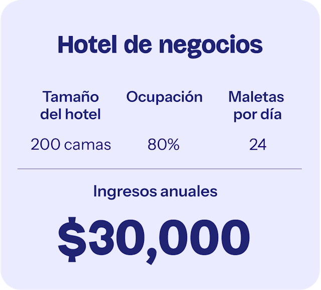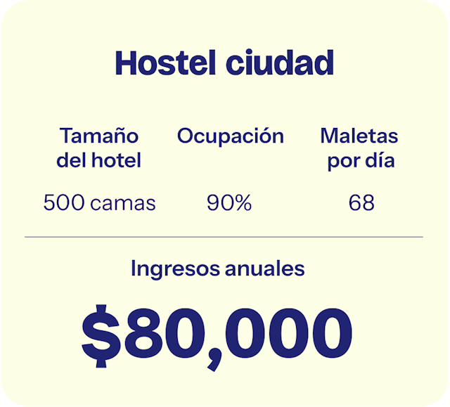 ¡Por supuesto! Muchos hoteles ya cobran por servicios como desayuno, spa, estacionamiento y pases diarios. El almacenamiento de equipaje es una oportunidad de ingresos similar que a menudo se pasa por alto. Un hotel con 300 habitaciones puede generar en promedio más de $50,000 en ingresos adicionales al año con esta simple adición. Es una manera fácil de mejorar tus servicios e ingresos con cambios mínimos en tu configuración actual.